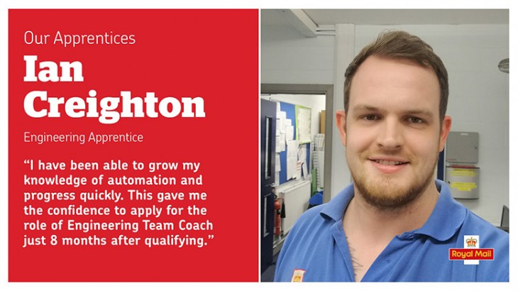 Since starting with Royal Mail, Ian has been able to apply the training he has been given in a number of ways. ‘With the initial apprenticeship engineering qualifications, I became a valuable member of the engineering team at Nottingham working on a shift rotation,’ he said. ‘This included maintaining the automation during maintenance windows and reactive maintenance and fault finding during periods where the operation was processing mail.