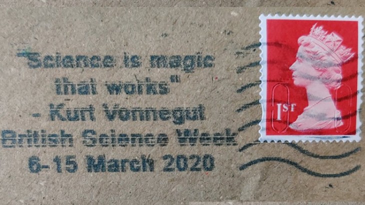 The postmark, which is appearing on all stamped mail from 6-15 March, reads: ‘Science is magic that works,’ a classic quote from Cat’s Cradle, a novel by sci-fi and fantasy author, Kurt Vonnegut, which explores issues of science, technology, and religion.