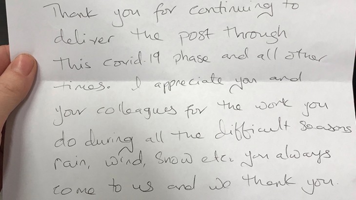 Thank you for continuing to deliver the post through this Covid 19 phase and all other times.