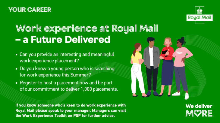 - We have a dedicated Work Experience guide on PSP to bring all the information together on how to host a great placement, including all the forms we need to complete to remain safe and compliant: WORK EXPERIENCE (royalmailgroup.com)